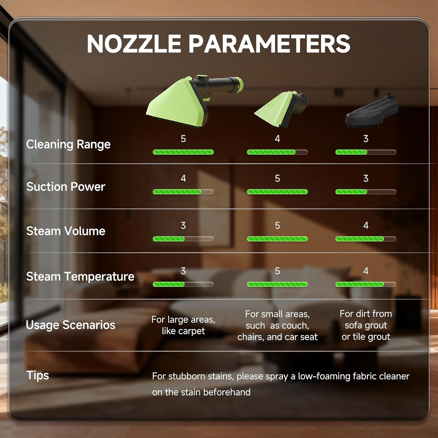 - 4 Cleaning Modes: Cold / Hot Mode handles stains like pet excrement; Steam Mode refreshes fabric furniture and cleans tile grout; Steam Sterilization Mode tackling stubborn oil stains. (Note: Allow 30 seconds for steam preparation when selecting "Steam" or "Steam Sterilization" mode.)