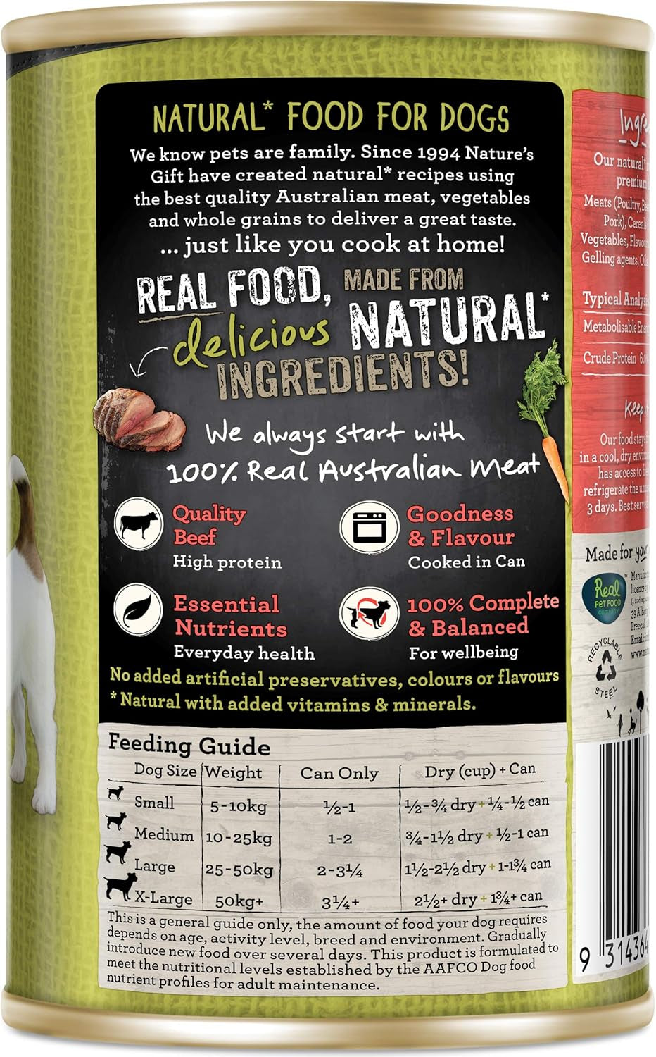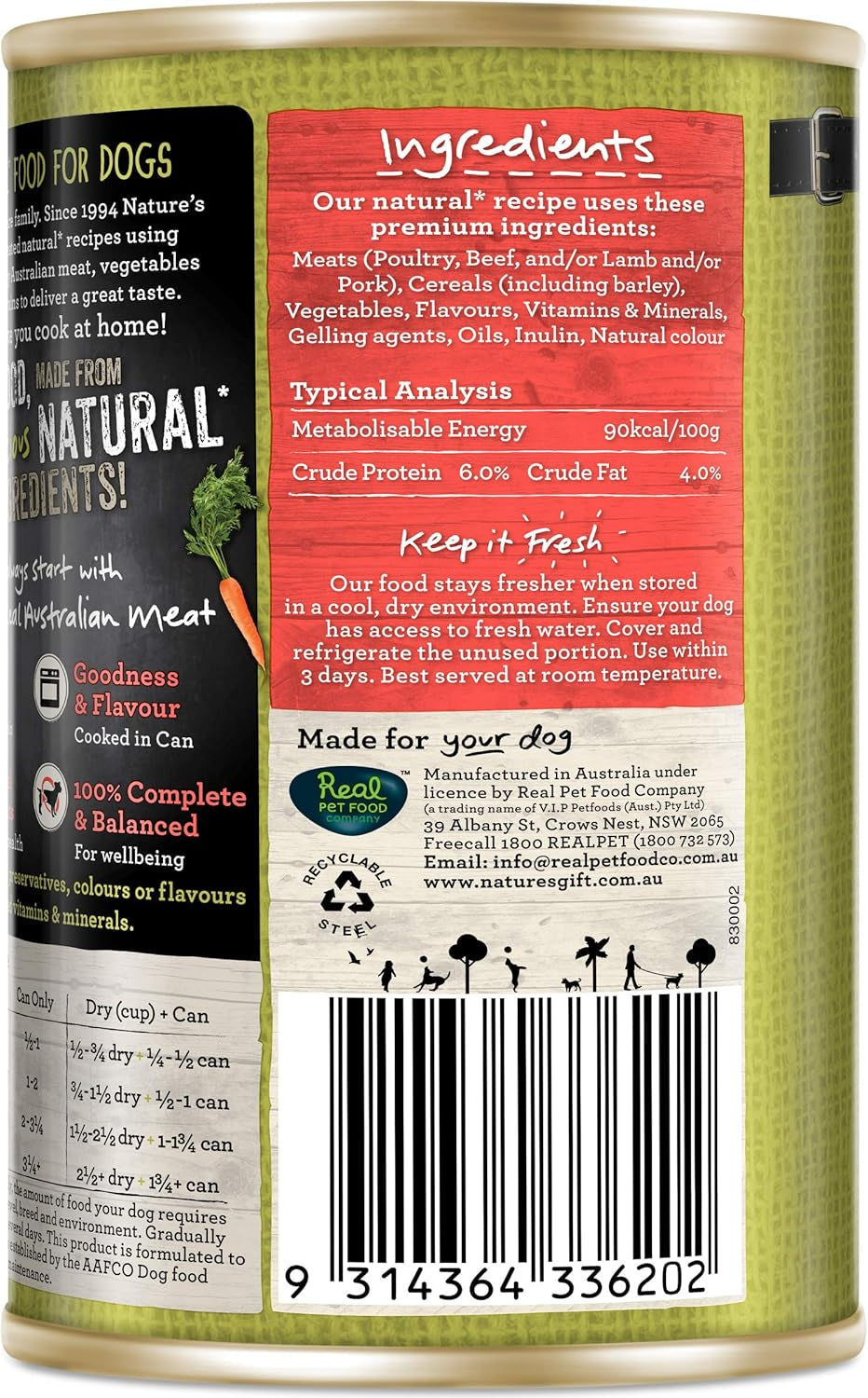 Natures Gift Adult All Breeds Loaf with Beef Vegetables and Barley Dog Food offers complete and balanced nutrition for your four-legged friend with its array of nutritious ingredients including quality meat and vegetables. With the Meal Time range, dogs don't just get a satisfying meal, they get all the nourishment they need to stay healthy too. This wet dog food recipe is crafted with no added artificial colors, flavors or preservatives.